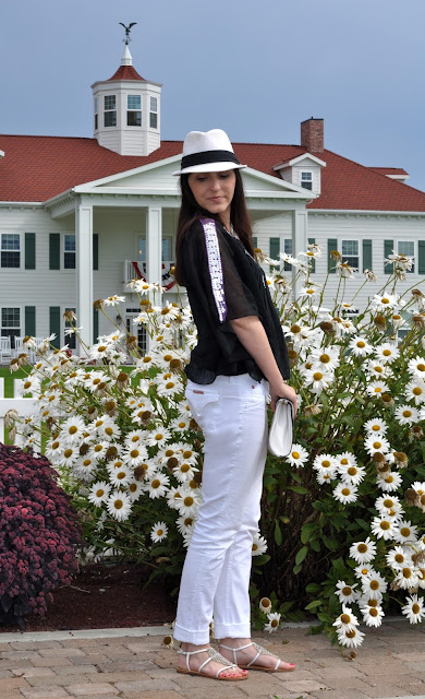 Hudson white jeans / Free people blouse (sold out) love this blouse option / Fedora (sold out) similar fedora / Black and white clutch similar clutch / crystal sandal Barney's New York (sold out) similar sandals I Forever 21 heart necklace I Essie 'watermelon' nail polish I